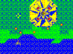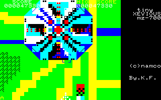 And computer ports there were many. Not necessarily the first one, but certainly the most primitive-looking was for the Sharp MZ-700, which like most games on the system is composed of custom text elements. Despite that, it is actually fairly competent and playable, although the difficulty is a bit harsh. To denote its inferiority, the game is humbly titled Tiny Xevious. This name it shares with the PC-6000 versions, of which there were actually two different releases. The first one completely changes around the levels and has the cross-hair really far away from the ship, which makes it hard to hit anything with he bombs. For some reason Pac-Man and the ghosts show up in the game, and it also uses a Pac-Man symbol to show the number of lives – but only after losing one of them, as there are no on-screen displays at all during play. This was followed by Tiny Xevious mkII. This one is the real deal and a more faithful translation of the arcade game, although it is slow and very choppy. Slow and very choppy are also the keywords for the X1 and FM-7 ports, which are further spoiled by terrible non-centering controls, the lack of semi-automatic firing (so the fire button has to be pressed again for every shot) heavy flickering and in the case of the latter an ugly color palette.