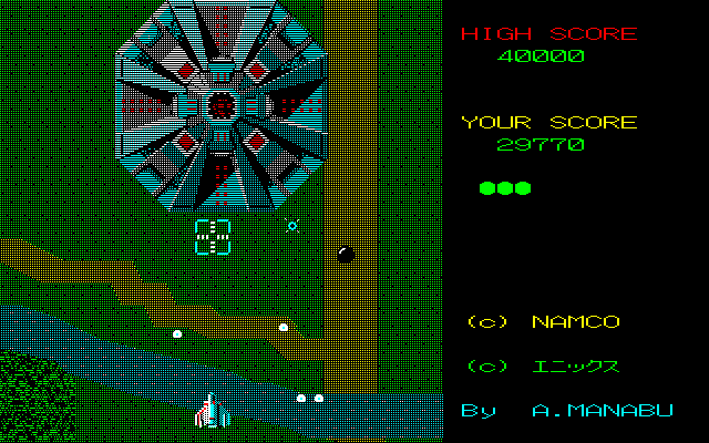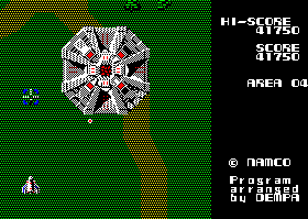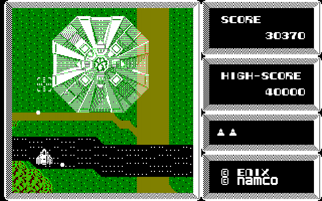 Most of these Japanese computer ports where made/publisheed by Dempa, although there are also a few versions by Enix, who hadn’t yet become synonymous with Dragon Quest. The first release was actually a Xevious clone called Alphos for PC-8801, which curiously enough still credits Namco’s copyright. This was programmed by Kazurou Morita, an extremely developer whose skilled allows for relatively smooth scrolling, a huge technical achievement for the computer. It features different stages and new graphics for most of the enemies, but it’s still very distinctly the same game. It has no background music and very sparse sound effects, but it’s fast, fluid and well-playable. Enix’ official port to the PC-8801mkIISR surprisingly is not quite as good (it was programmed by a different company, though). It may look good on still images, but in motion it has very choppy scrolling, while the sprites move fluidly enough. Sound and controls are very good, but like the FM-7 and X1 versions it lacks turbo fire, and enemy behavior seems to fluctuate more randomly than in other versions. Finally, Enix also published a version for the PC-9801, but in 1985, the current standard was everything but a suitable gaming machine. Graphics flicker heavily, the sound is very bad, and like many very early IBM PC games, the frame rate isn’t regulated, making it ridiculously fast on later systems. But even when throttling it down the pacing never seems quite right.