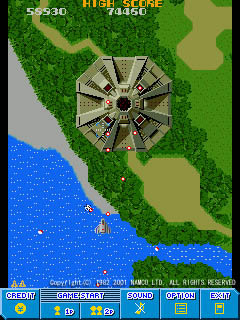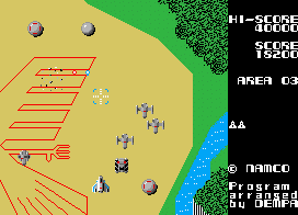 Xevious can be found in Namco Museum Volume 2 for the PlayStation, and it was also included on Xevious 3D/G for the system. Both packs include the original as well as Super Xevious. Both offer several display options, including tate mode for screens that can be turned to the side, which then use the full arcade resolution. Although Namco released the Namco Museum series to a great variety of platforms, Xevious was initially not among the most frequently re-released games. It is included in Namco Museum: 50th Anniversary for PlayStation 2, Xbox, GameCube and Windows PCs (but missing on the Game Boy Advance compilation of he same name), Namco Museum Remixfor Wii, Namco Museum Virtual Arcade for Xbox 360, and the download-only Namco Museum Essentials for PS3. On portables, it appears on the Western version of PSP’s Namco Museum Battle Collection, as well as Namco Museum DS. The latter has a terribly flickering horizontal display mode, but thankfully a much better vertical mode is available as well, which only adds some horizontal scrolling because the stages don’t quite fit on the screen. For some reason the original Xevious can also be unlocked in Namco’s Starfox Assault for GameCube. For the 3DS eShop, it was retouched at part of the 3D Classics line, adding depth between ground and air elements and moving clouds at the sides of the screen.