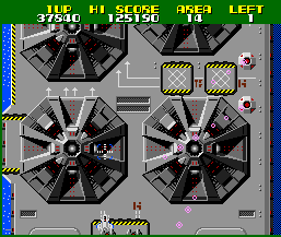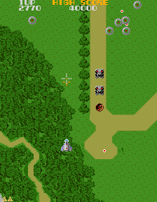 Unlike Galaxian-type games, the air vehicles that attack the Solvalou in formation don’t try to ram into it. Instead, they evade towards the screen’s sides (like the Toroid) or retreat after shooting (the Tarken). This was one of Endō’s ideas to make the game more realistic, as he thought no enemy soldier would behave so recklessly. The ground enemies generally are less of a threat. The Grobda tank for once doesn’t even shoot at the player. However, it can move rather quickly, making it hard to hit, and the score bonus for taking it down reflects that.
