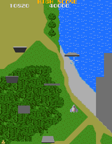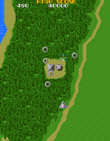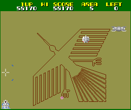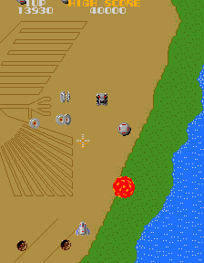 Xevious is often remembered for the many landmarks it introduced to shooters and gaming in general. It was the first vertical scrolling shooter to feature backgrounds graphics that weren’t a simple star field. Below Solvalou, forests, rivers and plains take form. The South American setting, a landscape that eventually opens up to the famous Peruvian Nazca lines, became a classic recurrence in shoot-em-ups. The game consists of sixteen areas that play continuously, each separated by a thick forest zone. Xevious does never end (perhaps one of its less progressive aspects) and loops after the end of Area 16. However, since most of the landscapes are recycled, a sense of deja vu creeps up well before reaching the sixteenth area; but, to the early Eighties’ gamer, Xevious offered quite a show. These environments actually played a part in the gameplay: you could figure out the pattern of a ground enemy by looking at which narrow path it would follow; destroy giant silos and other mysterious ground structures; not to mention the search for hidden towers and flags.