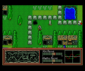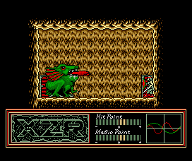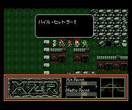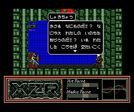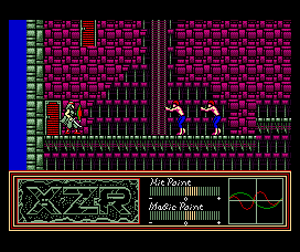 Combat is as you’d expect. Walk, jump, sword attack and, much later in the game, spells that allow you to cast magic such as fireballs and flying serpents. Enemies are generally easy. Occasionally a boss can prove troublesome, but levelling up will make short work of them, and all are weak against downwards attacks with your sword. For action scenes there are HP, MP and two statistics, AP and AC (Attack Power and Armour Class). These have a baseline number that increases through levelling or equipment, and are augmented by two heart-monitor style wavy lines which move and undulate (see the screens). These lines are a visual representation for randomisation during fighting, and while impossible to actually make use of, it’s nevertheless a nice graphical touch. Certainly much better than Morrowind‘s randomised and invisible “why the hell am I not hitting anything” system. It also ties in with the drug-taking mechanic, since in the same way that drugs alter your real-life heartbeat, so too do they alter your statistical heartbeats in XZR, while also increasing or decreasing stats, HP and MP.