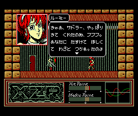 A sorcerer who teaches Sadler magic spells. Generally though he’s lazy and prone to leaving the party to sleep at an inn or a shack. For some reason his face is visible in the computer versions, but console ports have his entire face covered. In the console version of XZR II he also needs to be manually recruited, whereas in the computer version is already in your party. When playable he has homing magic, but isn’t very powerful.