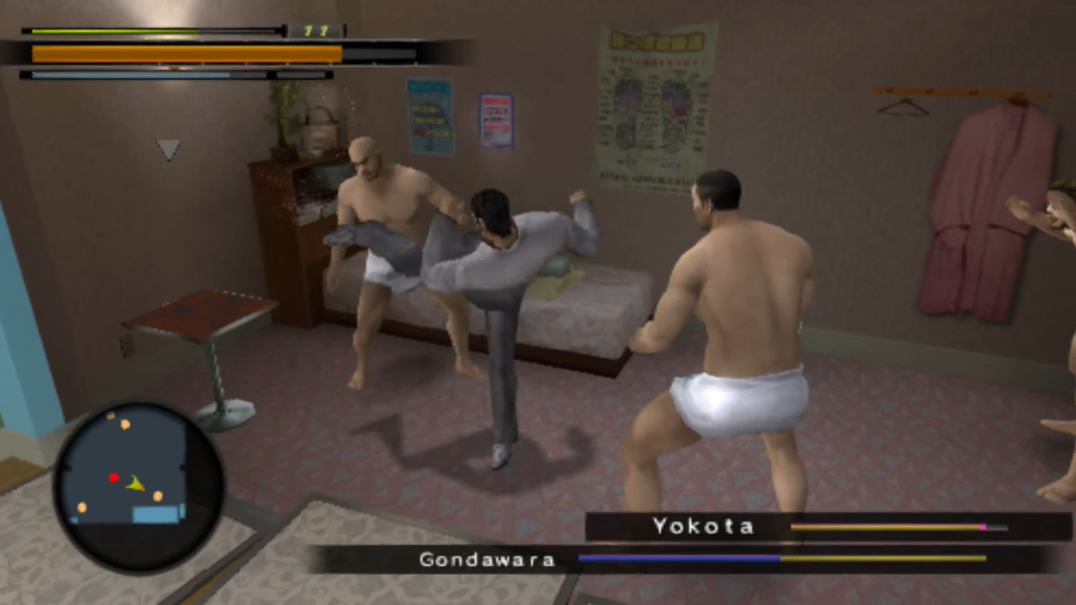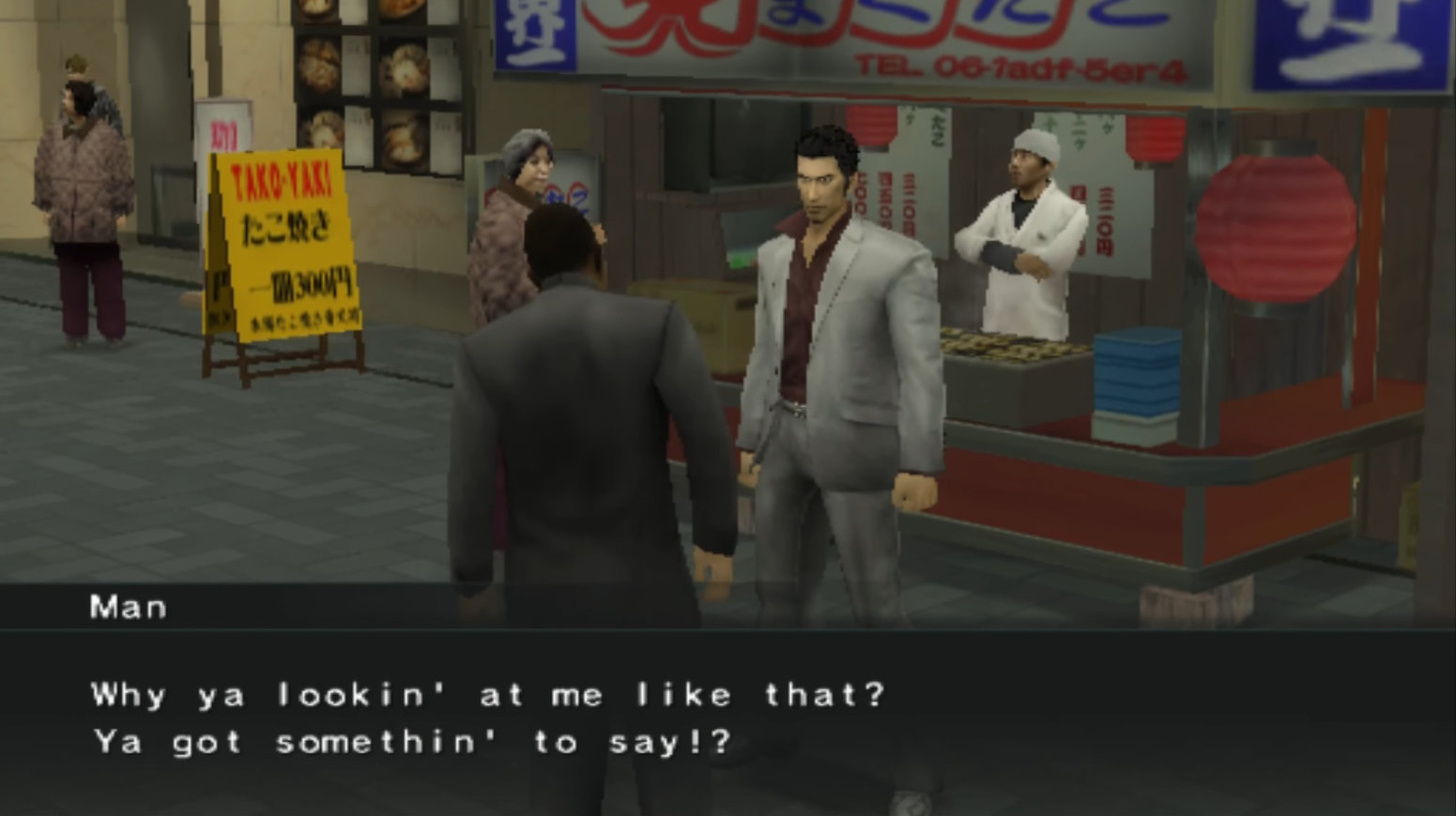 There’s also an expansion on the smaller side activities, giving them more unique sub stories, and just a general increase in variety. This includes arcades, which have a unique first person battle game made for Yakuza 2 specifically (it would not be until the fifth entry that we got Sega classic arcade machines). Sub stories also getting a bump in complexity and quality, including a funny early game one about trading junk that leads to you helping a depressed man beat up a politician. The wit and off the wall nonsense of later entry substories can be seen starting to form here, alongside the all time classic of the introduction of the Gondawara family and its big baby of a boss, and that is meant to be read very literally.