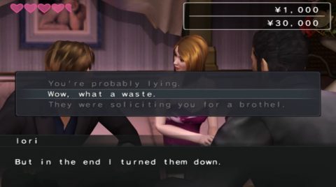 We also get our first two big side games this entry via the Marietta and Host Club Adam. The first is the introduction of cabaret club management, a series mainstay, and the weakest of the franchise. It’s more focused on running the business rather than focusing on the hostesses themselves and ends up a very lifeless affair. Host Club Adam, on the other hand, is a delightfully amusing side story that gives you the hilarious challenge of making known sentient rock Kiryu attractive to women. He has to be a host at a local club, which mostly amounts to giving satisfying conversation to the women who come to the club and hopefully convince them to buy high shelf alcohol. It’s a great use of textboxing, having a unique puzzle element of having to try and read the moods and interests of your customers to endear yourself to them, an unusual diversion even for this franchise.
