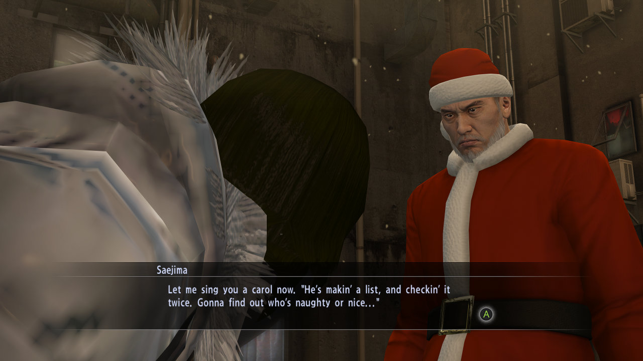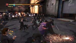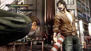 This entry has a significant engine update, so Kiryu, Akiyama, and Saejima all control as you remember, but with some slight modifications. For example, Akiyama can’t build heat like a madman by juggling enemies with wall bounces after they’re KO’ed anymore, but he can hit enemies on the ground easier, as can everyone else, which is useful. The one big addition is climax heat, a red heat bar that build up both to a big powerful special heat move, and helps fuel special moves for each character, requiring you to be in normal heat mode first.