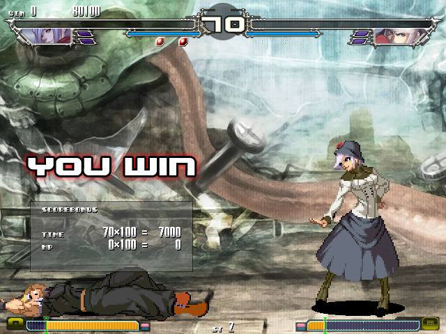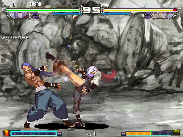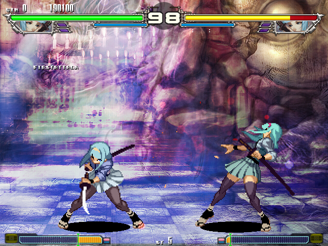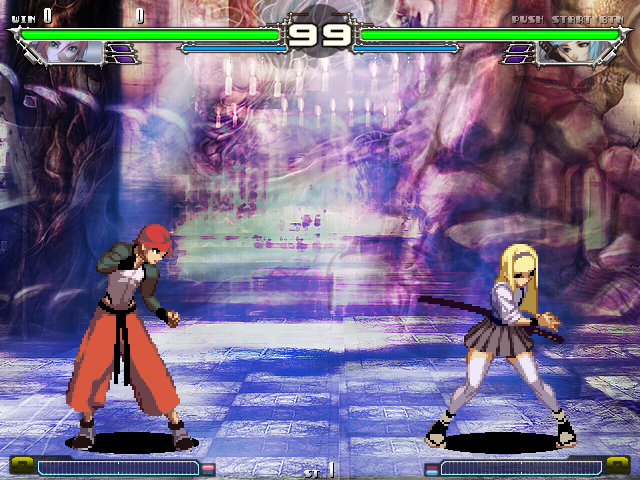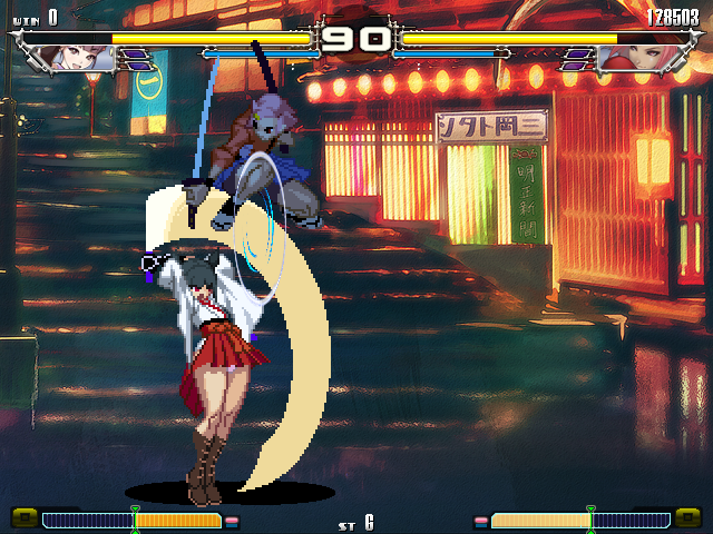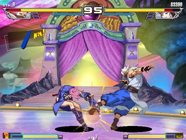 The graphics use a combination of low-res pixel art characters with more hi-res photoshopped backgrounds, evoking SNK’s Atomiswave era. The style of the arenas is a bit inconsistent. Some are kept in a realistic anime style, while others range from traditional Japanese paintings to borderline expressionism. Many of them look a bit trippy, and in a good way, but they are all still paintings with no variations or animations. The characters are animated all the better, despite a few weird frames and some moves that are a bit too reminiscent of The King of Fighters characters. The 4:3 aspect ratio also seems a bit antiquated. Shiza has documented experiments with a wide screen mode, on his blog, but that was never used in the actual game. With this type of game, though, a change in aspect ratio is bound to bring major changes to the dynamics of play, so that might be a reason.