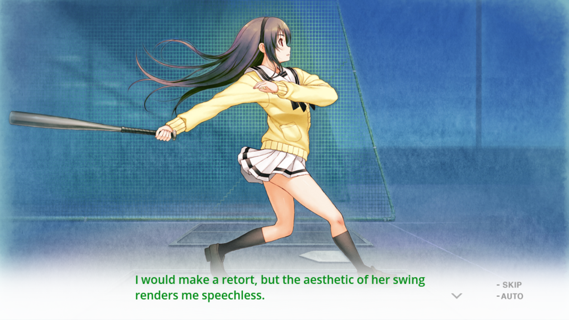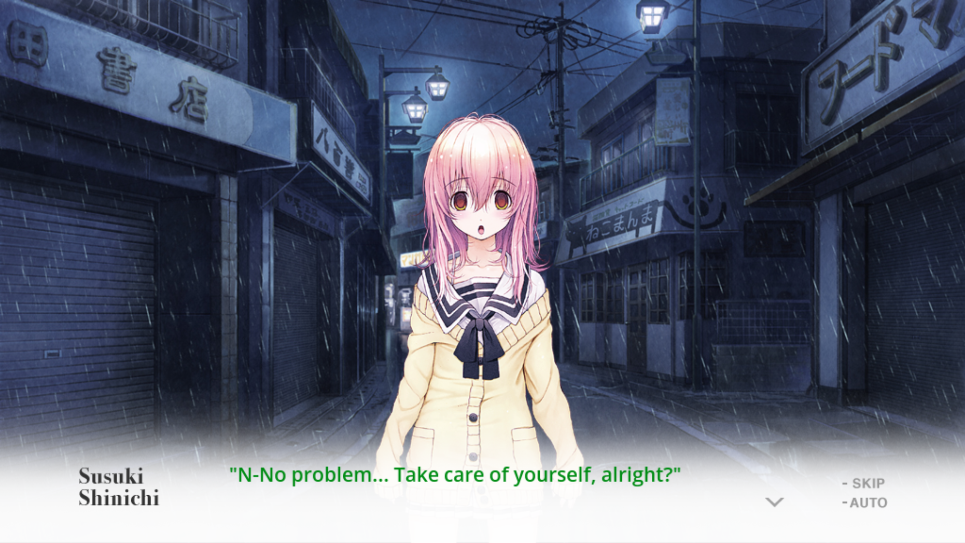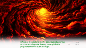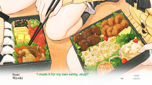 It does have its unsettling moments, but by no means is this visual novel a horror game. It’s also interesting, then, how the game is not afraid to point this out where the other two games rarely did so at the start. With Aoi as a self-proclaimed avatar, she is never hesitant to tell you her job, working desperately to get Shinichi on the romance route with Miyuki. She’ll tell you that it’s a game, or explain that she can’t get a cold standing in the rain because “there’s no CG” for her getting sick. Yet, this obvious pointing out does little against building your relationship up with the characters and emotionally investing yourself into the game.