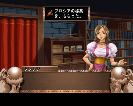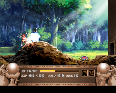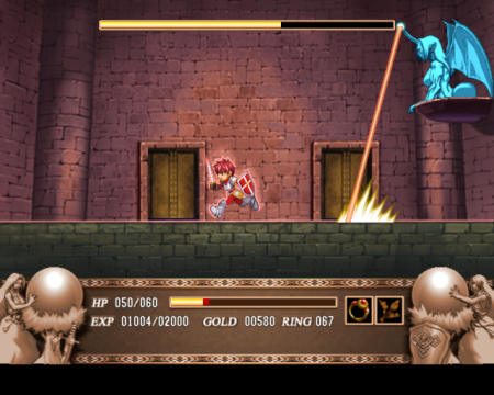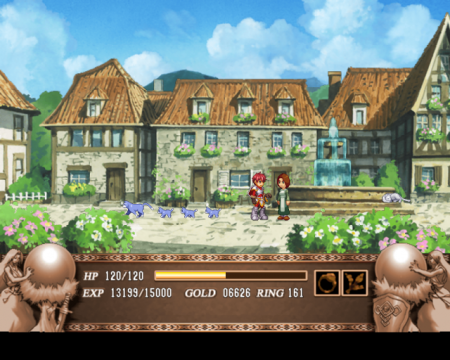 The PlayStation 2 version, released in Japan in 2005 (fifteen years after Ys III initially came out) by Taito, gives a big overhaul to the game to make it comparable to the Eternal remakes of the first two games. The graphics have been given a major upgrade, with extremely well animated, high res sprites, hand drawn backgrounds, and characters portraits for all of the major characters, including the shopkeepers. Most of the dialogue is fully voiced, including Adol’s, for the first time in the series. The mechanics have been upgraded, too – bad guys are stunned when hit, and Adol has a bit of invincibility time when he is hurt, so say goodbye to those irritating insta-kills from before. Unfortunately, you can’t hold down the attack button anymore and buzzsaw your way through bad guys, although Adol has a pretty cool four hit slashing combo. There is also a separate upwards slash.