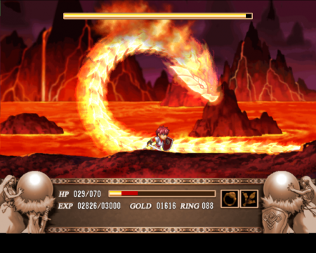 For all of the positives, however, there are some cryptic changes. While the game overall feels less broken than all of the other versions, hitting bad guys in mid-air is still difficult, and the difficulty is very unbalanced. On the Normal setting, almost all of the bosses are pansies. There are other weird issues too – the enemy life gauge has been removed, save for boss battles. Most of the levels don’t scroll – instead, they fade in and out as you move from screen to screen. As a result, a lot of the cool multiplane scrolling is missing. So are a lot of the background details. Those awesome waterfalls in the Tigre Mines? Gone. The Volcano in the Ilburn Ruins? Also gone. But the biggest problem is that, other than fixing the controls, Taito didn’t do much to the actual structure. The stages are still linear and dull, and the whole game can still be beaten in three hours. You would think that the wisdom of hindsight would provoke the designers to severely overhaul the game from its core, but they didn’t. As a result, only people that really loved Ys III in the first place could really dig this version. Only a few months after the PS2 release, Falcom published their own remake of Ys III, dubbed The Oath in Felghana. Since it uses the Ys VI engine, the gameplay is entirely different – you can read about it later in the article.