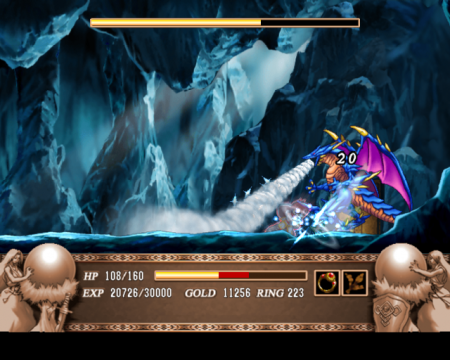 When it was originally released, Ys III was something of a technical marvel due to its multiplane background scrolling. It seems quaint now, but this was a big deal for the PC88 back in 1989, even if it is slow and choppy in its original incarnations. From a control standpoint, the side scrolling venue is a little awkward at first, especially when attacking in mid-air, but Adol swings his sword like a buzzsaw and the joy of dashing back and forth, cutting through enemies to steal their luscious experience, is still maintained. Like the other games, a lot of time is spent power leveling, because skill isn’t something that will win battles here. There’s no magic, but the rings are back for a variety of effects (higher offense, higher defense, time slowdown, etc.), although you can only use them for a limited amount of time, which is recharged by slaying enemies.