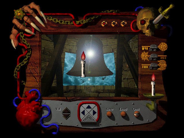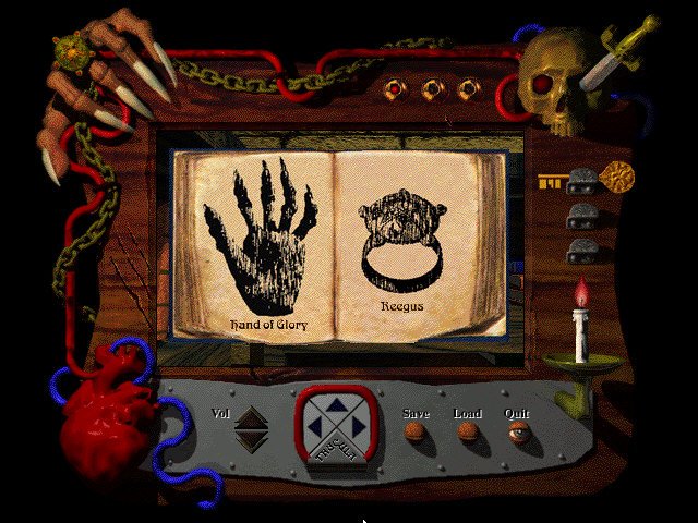 You can interact with objects in the game through the standard practice of clicking on them, whether it be opening a door, ringing a bell, or talking to an NPC, standard adventure game mechanics. What isn’t made clear to the player is that the rather cumbersome-looking HUD is in fact your inventory and menu rolled into one. That clawed hand in the top left? You store a ring you find in the game on one of it’s fingers. That candle in the top right? That isn’t for a direction, it’s actually one of many items you need to defeat the Demon King. To use it you drag it out and voil? you can now light fireplaces with it. Later on you collect more items such as sword, and the ring is needed to defeat the few hostile NPCs you encounter in the mazes later on in the game, mostly goblins.