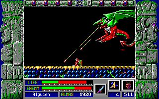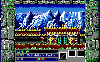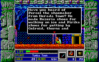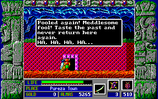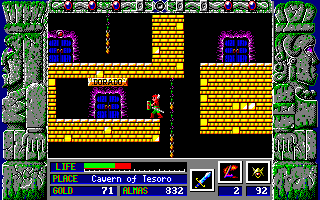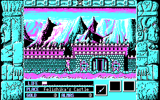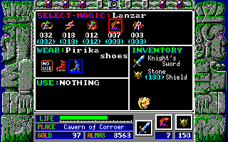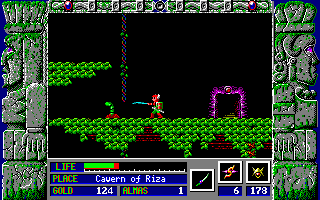 Zeliard is infamous for its difficulty, and playing this game even past the first dungeon will require a lot of skill, practice and planning from the player. Enemies will eat away at your health and the game expects you to grind a lot to make any progress at all. The main loop thus consists of entering a dungeon, killing monsters to get experience points and Almas (the souls of monsters), return to town without dying, exchanging Almas for Gold at the bank, paying for healing at the inn and talking to the sage to see if you have enough experience to gain a level (which extends the health bar and increases the attack power). This is repeated until bit by bit you can survive further into the dungeon. Eventually you’ll find keys to open locked doors and get enough gold to buy better swords, shields and magic potions to take on the boss. After the second boss, the game starts to mix things up a bit by having you look for new items that allow you to pass previously impassable obstacles. Different towns will also have different Alma:Gold exchange rates, generally making money farming more laborious the further you play…