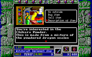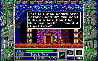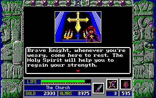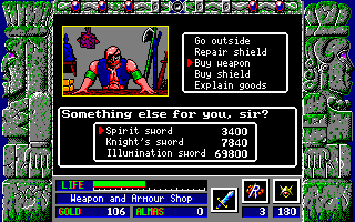 On the highest graphics settings of the MS-DOS port, Zeliard looks decent for its age. The PC88/X1 versions look just slightly worse and have choppier scrolling. The music is one of the game’s biggest assets and sounds great on the AdLib Setting. The title screen music is especially banging, with the punchy bassline of the PC88 version possibly making it the best rendition. The PC88/X1 has digitized voices during the dialogue in the intro and in some shops, but the quality is not very good and it is understandable why it was not implemented in the English translation.