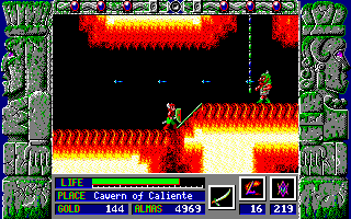 It used to be common that Western ports were tweaked with elevated difficulty to prevent people from renting a game and beating it in a sitting. As such, many games from the 80s and 90s that Western players consider difficult might be easier in their original Japanese releases. Zeliard, however, is an example of the opposite: the MS-DOS port by Sierra was not only localized for English-speakers, but also features a handful of changes that tune down (!) some of the difficulty of the Japanese versions. For instance, enemies in general give more XP and collectibles when defeated, Alma:Gold exchange rates are more favorable, health can be regenerated by standing still in a dungeon, and when you die, you lose less Almas and even gain a little XP instead of losing it all. However, maybe as an attempt to balance the tweaks, when you die in the MS-DOS version you respawn in the first town and not in the last you visited as on the PC88/X1. Save games still start you in the town where you last saved, though, so reloading saves soon becomes crucial in the MS-DOS port. The port also adds some quality-of-life features such as a dedicated pause button, the option to change to speed of the game and support for multiple save files. In comparison to the Sierra port, the Japanese releases of Zeliard are masochistic experiences that require significantly more rounds of the grinding loop. For new players the MS-DOS version is clearly the version to play.