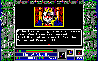 The story, presented in rich cutscenes, is a standard fantasy-RPG affair: a demon lord named Jashiin has been resurrected and conjured a cursed rain on the land of Zeliard that has turned the princess to stone and the land to desert. As the king laments his loss, the guardian spirit of Zeliard appears and explains that the demon lord can be defeated by collecting nine holy crystals from the underground. The next day, a stranger named Duke Garland arrives, and is tasked by the king to save the kingdom. The game consists of eight dungeons in which you need to find and defeat a boss monster that guards the crystal. Garland’s main weapon is a sword and each crystal will unlock a new secondary magic attack. In and between each dungeon is at least one town where you can level up, buy gear and consumables, get hints from townspeople and heal your character.