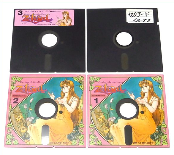 The Japanese floppies (here: X1) came with beautiful custom outsides. The user had to supply a fourth disk of their own (to which progress was saved) in order to run the game.