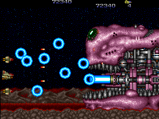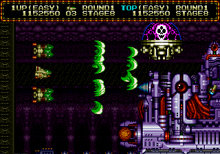 Many of the enemy designs are inspired by Gradius or R-Type, featuring similar mechanical and biologically themed enemies. Like in Hellfire, one of the bosses closely resembles Big Core, for that matter. Fortunately, Zero Wing has plenty of original ideas that set it apart from the series it often copies. The bullets spin in a strange, three-dimensional way that has them alternating between being circles and lines. Some of the level designs are very ingenious, especially the Barricade Zone. It really is one of the coolest levels in the game and shows a bit more creativity than most games when they try to make an R-Type inspired level. The overseas arcade version allows two player simultaneous play and resurrects players where they die, rather than sending back to a checkpoint.