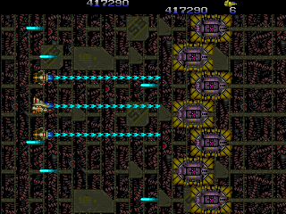 There are three different types of weapons, typical of Toaplan shooters. They are red spread shot, blue laser, and green homing. Each weapon has three arms levels that can be raised by picking up the same power up twice. The Mega Drive version has a secret fourth weapon level that makes your firepower even stronger and your satellites even bigger.