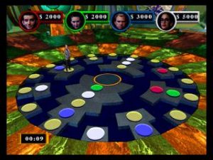 Winning minigames earns you time, which gets added to a certain amount that all players get for free. Once all the players have had a turn, everybody moves onto the Money-Go-Round. Your character is placed on a wheel of rotating platforms, each of which has a colored circle upon them. By stepping on one of these circles, you’ll change it to your color and earn some cash. The more time you’ve earned in a minigame, the longer you get to stay on the wheel. Run out of seconds, and your time on the wheel for this round is over. However, by stepping on the circle in the middle of the wheel, you’ll end your turn early, but you’ll get to return to it should you have any time on your clock remaining.