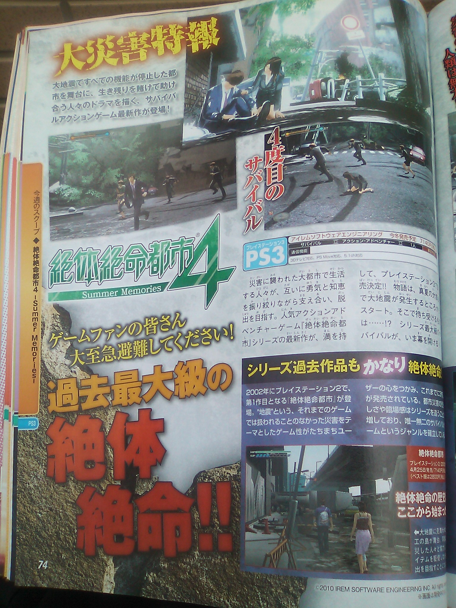 This report on Adriasang detailed what it would contain: "The game takes place in a big city in the year 201X. It's July, the heart of summer, and your character is visiting the city for a job interview. The city is suddenly hit with a major earthquake. Your goal is to escape the destroyed city, finding safe paths through collapsing buildings and dealing with panicked and fleeing people. Sadly after on March 11, after the 2011 earthquake and tsunami in Japan, it was cancelled. Irem never went into detail about why, but given that the story revolved around someone trapped in a city destroyed by an earthquake, the implications are obvious. Soon after this Irem also set about deleting their back-catalogue of games from download services, and shutting down their websites. Series creator Kazuma Kujo left Irem shortly after the cancellation to form a new company, Granzella, though he states this was no due to the cancellation. After this he began tweeting about the cancelled game, revealing much of what it would have contained. Adriasang then posted an article with these details. The sad irony is that while the earthquake took place on March 11, the game had originally been slated for release on March 10, but had been delayed. In an interview with GamesTM magazine, Kujo explained how close it came to release: In a subsequent interview with 1UP, Kujo elaborated on this: Not that Kujo was happy with the decision, elaborating on Irem's reluctance to discuss the subject: The GamesTM interview detailed some of the public's reactions, as Kujo explained: As revealed in the 1UP interview, he received over 500 letters: Unfortunately Irem still holds the rights to the series and has no intentions of releasing the fourth instalment - in fact there have been rumours they may have even deleted the entire thing. Kujo has addressed this in his Twitter feed, expressing regret if Irem have. He has though tweeted the entire story of the game, as a final farewell to fans. A compilation is HERE. Given that Irem has abandoned videogames to focus on pachinko, it's unlikely we'll ever get to play Zettai Zetsumei Toshi 4. Even if a beta copy, burned to Blueray for debug purposes, somehow surfaced, you'd need a CFW PS3 to run it. And there would be no chance of sharing it online like with previous generations of leaked games, given the quantity of data. Such a precious item would, sadly, be traded for high prices among collectors. Perhaps we should all get together and form a Kickstarter to get it out of Irem's hands? Links: