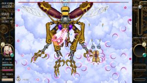 Also, despite channeling the style of TwinBee, most of the enemies are just mechanical ships, so it doesn’t feel much like a cute-em-up despite the colorful visuals. The bosses are the most impressive foes, as most of them are large robots based on animals like lizards and insects. Dialogue bubbles pop up during gameplay, as your characters remark on the action or trade barbs with the bosses, but there’s not much else in the way of story or cutscenes. Even the post-level reward images are just static pictures compared to the little animated tidbits of the TwinBee games. Overall, the whole game just feels kind of flat. The backgrounds also suffer from noticeable shimmering, which is typically an artifact of porting older titles with different resolutions, but considering this game was made for modern hardware, it looks unusual. Plus, the character portraits look pixelated, like they were resized incorrectly.